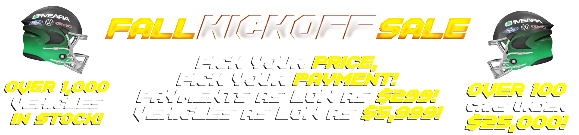 Are you ready for some football...and unbeatable deals? Join us for our Fall Kickoff Sales Event at O'Meara Motors! With over 1,000 vehicles in stock, we're tackling high prices to bring you the best offers of the season. Whether you're looking for a brand-new ride or a dependable pre-owned vehicle, now's your chance to score big!