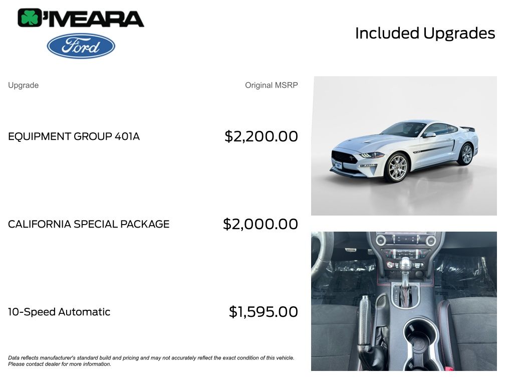 This Mustang GT Premium is more than just a high-performance machine â" it's a statement of style and sophistication. The sleek, aerodynamic exterior is complemented by the California Special Package, which adds unique design elements like the offset tri-bar pony logo and pedestal rear spoiler. Step inside, and you'll be greeted by a premium cabin that combines the latest technology with luxurious comfort.