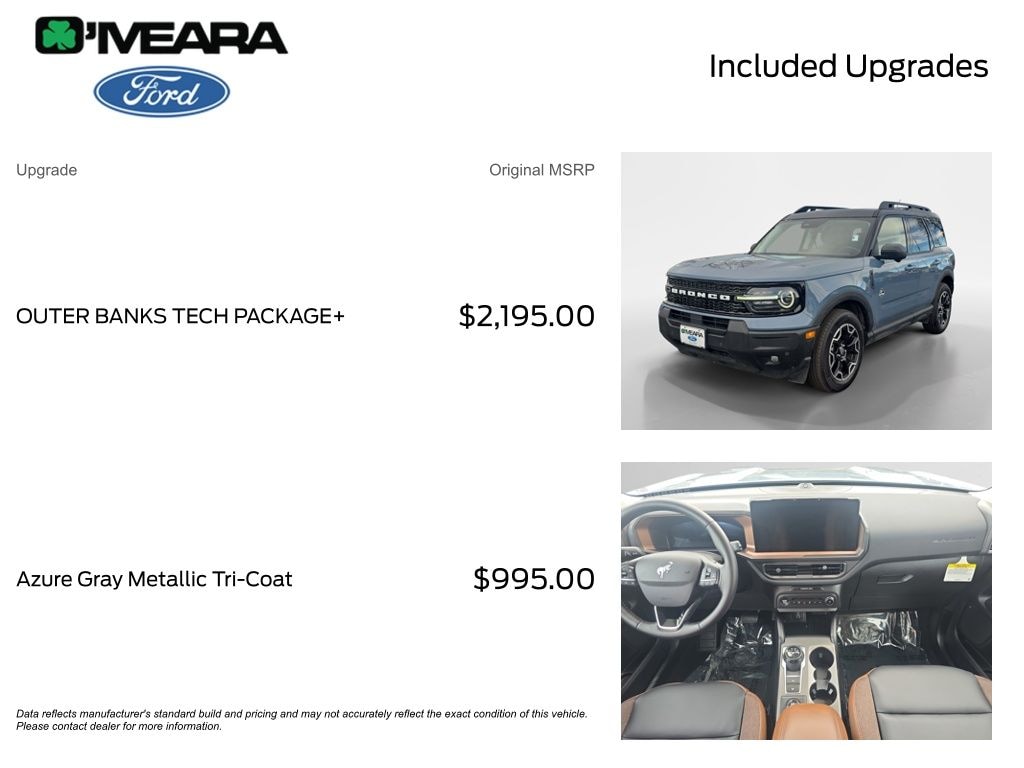 Azure Gray Metallic 2025 Ford Bronco Sport Outer Banks 4WD 8-Speed Automatic 1.5L EcoBoost Local Trade, Non-Smoker, 360-Degree Camera w/Trail & Split View, Alloy wheels, Auto-dimming Rear-View mirror, B&O Sound System by Bang & Olufsen, Brake assist, Connected Navigation, Electronic Stability Control, Equipment Group 300A, Front dual zone A/C, Front Parking Sensors, Garage door transmitter, HD Radio, Heated door mirrors, Heated steering wheel, Illuminated entry, Outer Banks Tech Package+, Panic alarm, Power door mirrors, Power windows, Rear seat center armrest, Rear window defroster, Remote keyless entry, Reverse Brake Assist, Security system, SiriusXM, Speed control, Steering wheel mounted audio controls, SYNC 4 w/Enhanced Voice Recognition, Wheels: 18" Ebony Black-Painted Aluminum.