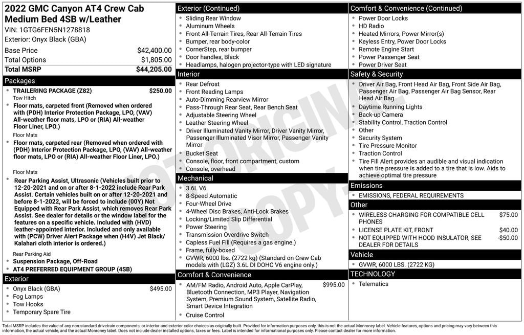 NON SMOKER, APPLE CARPLAY, ANDROID AUTO, Canyon AT4 w/Leather, 4D Crew Cab, V6, 8-Speed Automatic, 4WD, Onyx Black, Jet Black/Kalahari Leather, Hitch Guidance, Preferred Equipment Group 4SB, Tow/Haul Mode, Trailering Package.