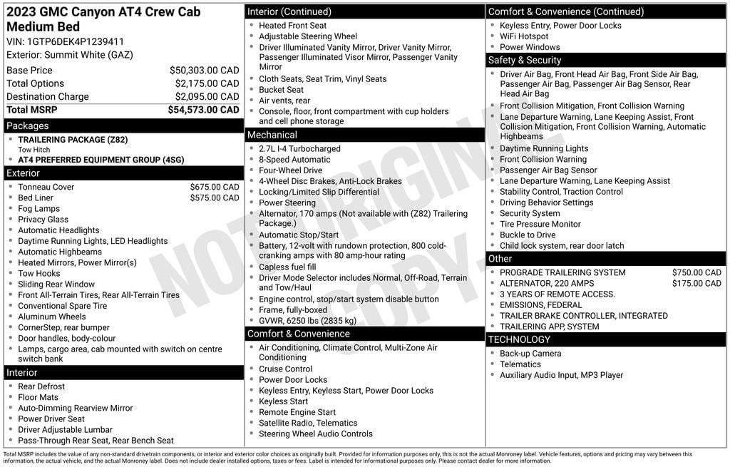 NON SMOKER, APPLE CARPLAY, ANDROID AUTO, Canyon AT4, 4D Crew Cab, 2.7L Turbo, 8-Speed Automatic, 4WD, White, Jet Black/Teak w/Perforated Leather-Appointed Seat Trim, 2 1st Row USB Charge/Data Ports, 6-Speaker Audio System Feature, Auto High-beam Headlights, Automatic Emergency Braking, Automatic Locking Rear Differential, Canyon Pro Safety, EZ-Lift & Lower Tailgate, Following Distance Indicator, Forward Collision Alert, Front dual zone A/C, Front Pedestrian & Bicyclist Braking, IntelliBeam Automatic High Beam On/Off, Lane Keep Assist w/Lane Departure Warning, Navigation System, ProGrade Trailering System, Radio: 11.3 Diagonal Premium GMC Infotainment Sys, SiriusXM w/360L, Stop/Start System Disable Button Engine Control, Trailering App System, Trailering Package, Variably intermittent wipers, Wireless Apple CarPlay/Wireless Android Auto.
