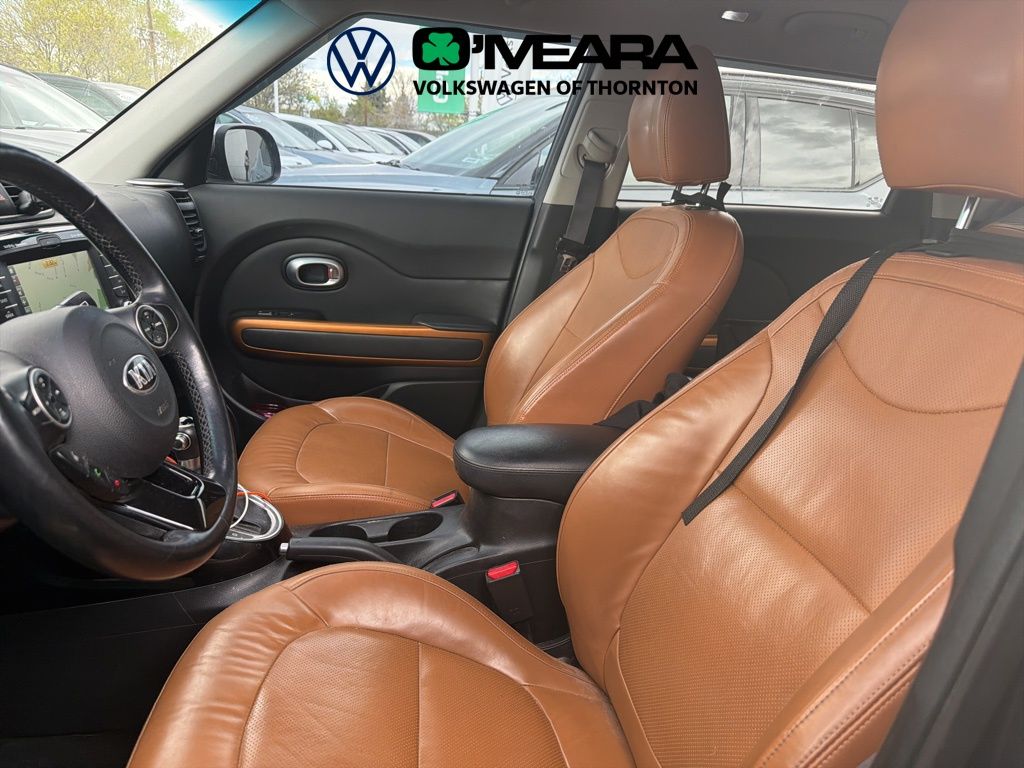 Soul Exclaim, 4D Hatchback, I4, 6-Speed Automatic, FWD, Fathom Blue, Black Leather, 10-Way Power Adjustable Driver's Seat, 17" x 6.5J Alloy Wheels, 4-Wheel Disc Brakes, 6 Speakers, ABS brakes, Air Conditioning, Alloy wheels, AM/FM radio: SiriusXM, Auto-dimming Rear-View mirror, Automatic Temperature Control, Brake assist, Bumpers: body-color, Cargo Net, Cargo Tray and Seatback Cover, Carpeted Floor Mats, Chrome Mirror Caps, Driver door bin, Driver vanity mirror, Dual front impact airbags, Dual front side impact airbags, Electronic Stability Control, Emergency communication system, Engine Immobilizer, Exterior Parking Camera Rear, Front anti-roll bar, Front Bucket Seats, Front Center Armrest, Front fog lights, Front reading lights, Front wheel independent suspension, Fully automatic headlights, Heated & Ventilated Front Seats, Heated door mirrors, Heated Outboard Rear Seats, Heated Steering Wheel, Hood Film, Illuminated entry, Leather Seat Trim, Leather steering wheel, LED Positioning Lights, Low tire pressure warning, Occupant sensing airbag, Outside temperature display, Overhead airbag, Overhead console, Panic alarm, Panoramic Sunroof w/Power Sunshade, Passenger door bin, Passenger vanity mirror, Power door mirrors, Power driver seat, Power steering, Power windows, Premium audio system: UVO, Premium Package, Projector Headlights, Push Button Start, Radio: AM/FM/MP3 Audio System, Radio: Navigation w/Infinity Audio System, Rear Bumper Applique, Rear seat center armrest, Rear window defroster, Rear window wiper, Remote keyless entry, Speed control, Speed-sensing steering, Split folding rear seat, Steering wheel mounted audio controls, Supervision Gauge Cluster w/4.3" TFT Color LCD, Tachometer, Telescoping steering wheel, Tilt steering wheel, Traction control, Trip computer, Turn signal indicator mirrors, Umber Colored Interior Accents, Umber Package 2, Variably intermittent wipers.