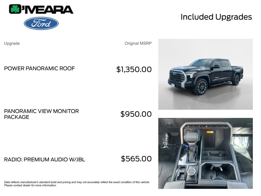 Safety is also a top priority, with a suite of advanced driver-assistance technologies, including a Panoramic View Monitor, Rear Camera, and a comprehensive safety system that includes airbags, stability control, and more. Whether you're navigating city streets or tackling off-road adventures, this Tundra Hybrid Limited is equipped to handle it all with confidence and style.