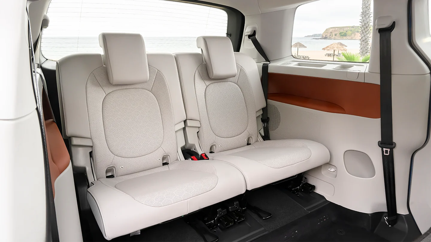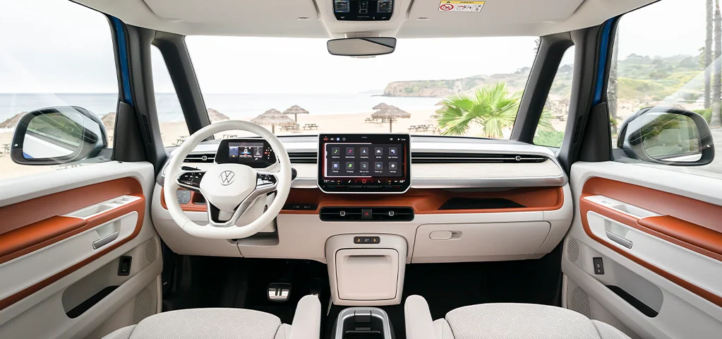 Inside the ID. Buzz, you can choose from three stylish color options: Moonlight, featuring dark brown leatherette with white piping; Dune, with light grey leatherette and clay-colored piping; and Copper, showcasing rich brown leatherette with yellow piping. The spacious interior offers three rows with various seating configurations for up to seven passengers, along with available features like captain's chairs, a panoramic glass roof, the Flexboard cargo system, and more.